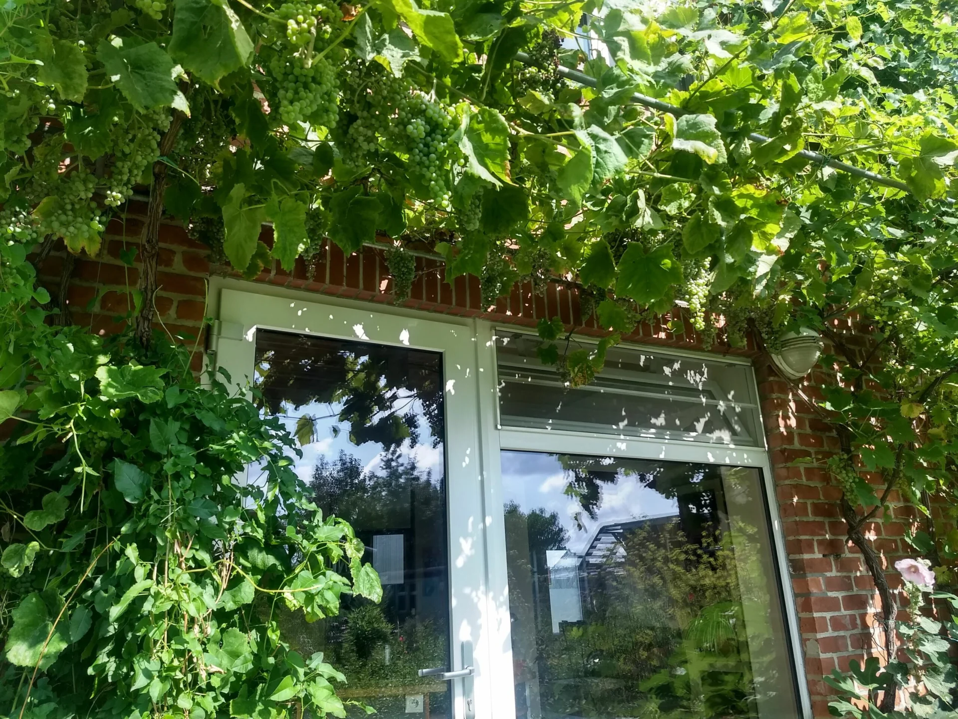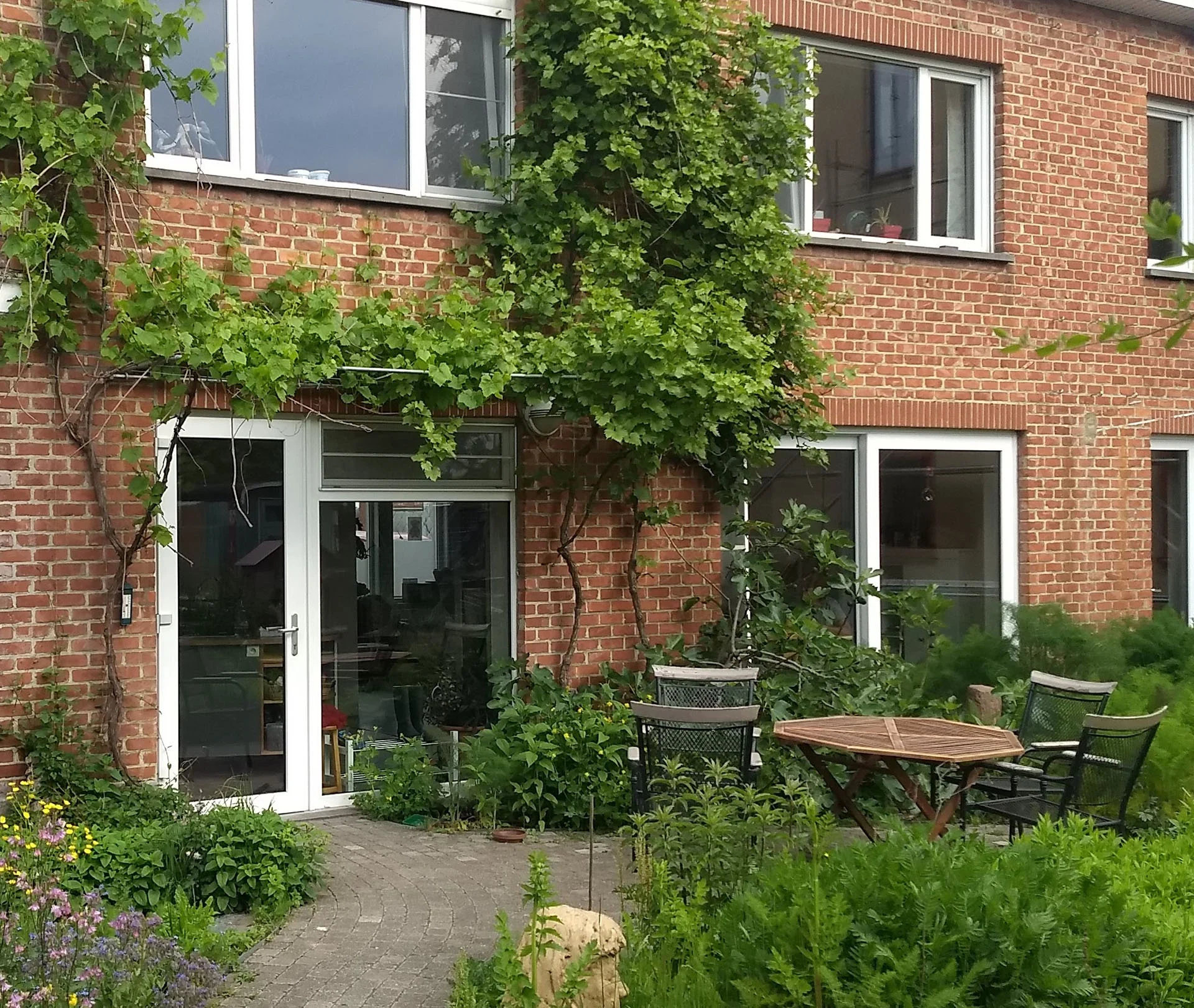 Een zonnewerende gevel, met niet-groenblijvende klimmers; ‘s zomers lekker fris en groen, ‘s winters vallen de bladeren af en kan al het licht weer binnen.