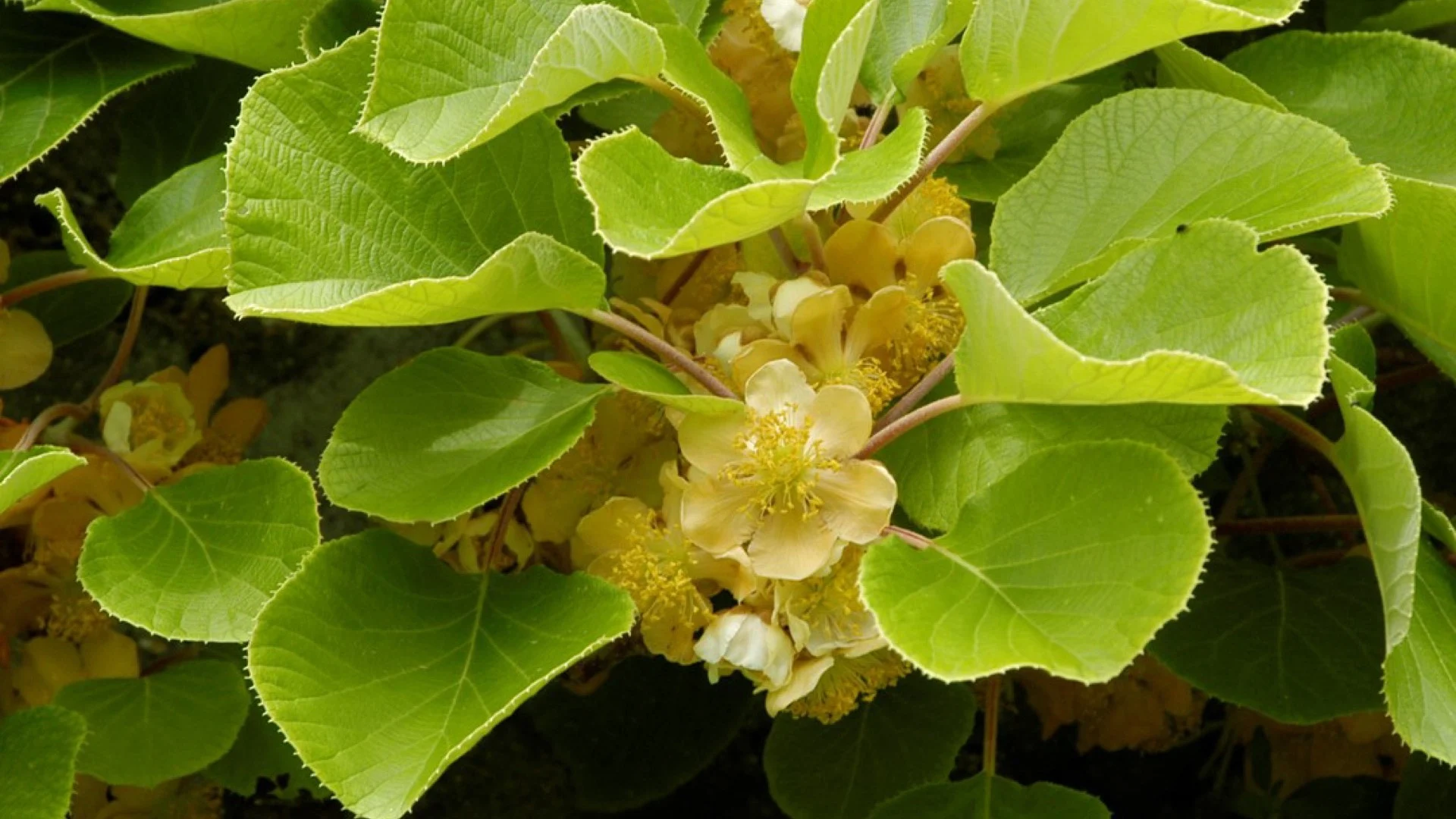Actinidia deliciosa is de bekende kiwiplant, een krachtige, bladverliezende klimplant die niet alleen decoratief is maar ook heerlijke vruchten levert. De grote, hartvormige bladeren zijn donkergroen en ruw behaard. De plant bloeit in mei-juni met crèmewitte bloemen die langzaam geel verkleuren. Kiwi is tweehuizig: je hebt een mannelijke én vrouwelijke plant nodig voor vruchtzetting. De bekende bruinbehaarde vruchten met groen vruchtvlees rijpen in de herfst. De plant klimt door te winden en kan 8 tot 10 meter bereiken. Ze verkiest een beschutte, warme standplaats in volle zon met vruchtbare, goed gedraineerde, licht zure grond. De winterhardheid is goed, maar late nachtvorst kan de bloei beschadigen. Populaire vrouwelijke cultivars zijn 'Hayward' en 'Jenny' (zelfbestuivend). Een stevige steunstructuur is noodzakelijk.