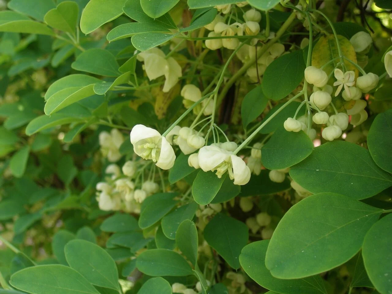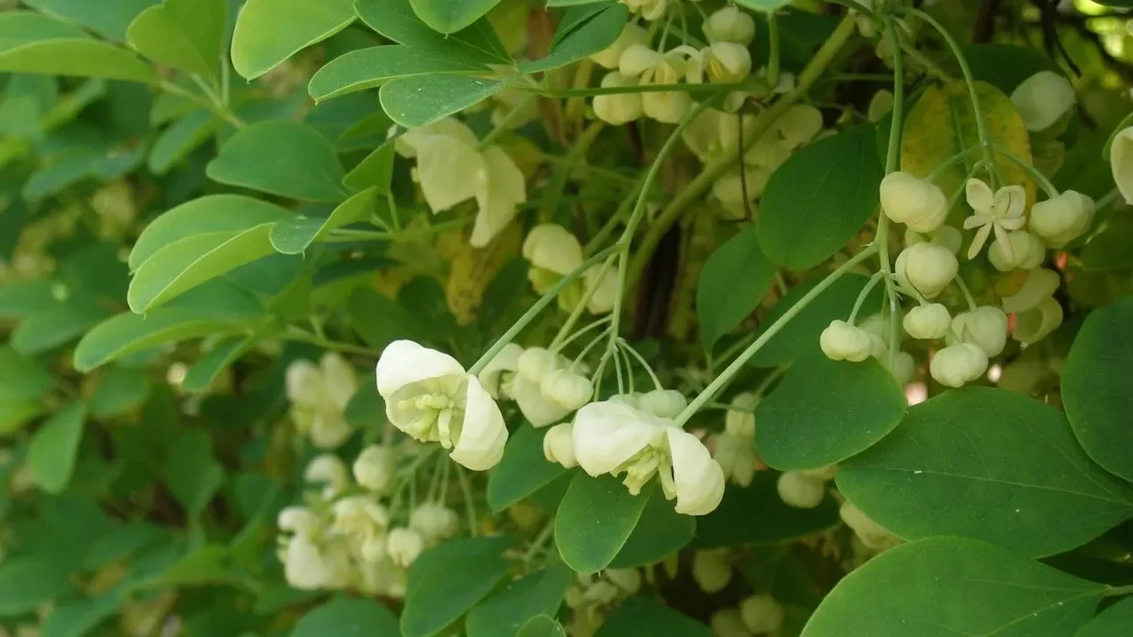 Akebia quinata 'Alba' is een bijzondere, halfgroenblijvende klimplant die opvalt door haar sierlijke witte bloemen — een zeldzame cultivar van de doorgaans chocoladepaars bloeiende klimaugurk. In april en mei verschijnen hangende trossen van kleine, klokvormige, witte bloemen met een intens zoet parfum dat aan vanille en chocolade doet denken. De vrouwelijke bloemen zijn groter dan de mannelijke en verschijnen samen op dezelfde tros, een uniek kenmerk van deze soort. Het blad bestaat uit vijf ovale, heldergroene blaadjes aan één steel en blijft in zachte winters grotendeels aan de plant.